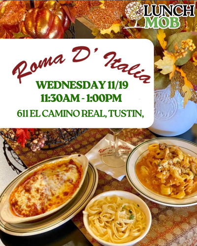Join us for the Tustin Chamber of Commerce Lunch Mob on Wednesday, August 20th at Roma D' Italia from 11:30 AM to 1:00 PM!